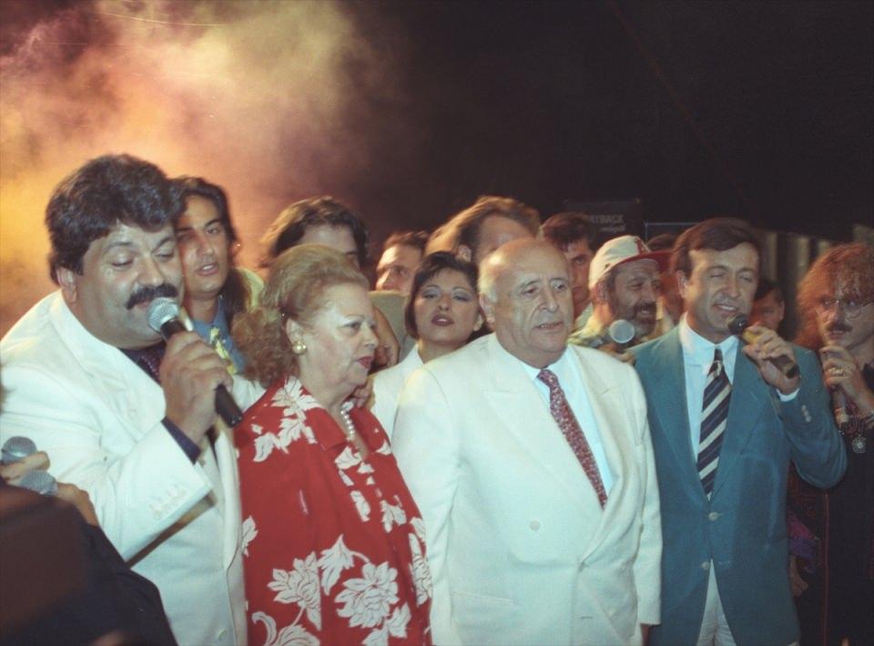 Dönemin Cumhurbaşkanı Demirel (sağ 3) ve eşi Nazmiye Demirel 20 Ağustos 1994'te düzenlenen gecede sahne alan sanatçı Harun Kolçak (sağda), Erol Evgin (sağ 2), Osman Yağmurdereli (solda), Çelik (arka solda), Bendeniz (arka ortada), Gazeteci Savaş Ay (arka sağda) ile birlikte...