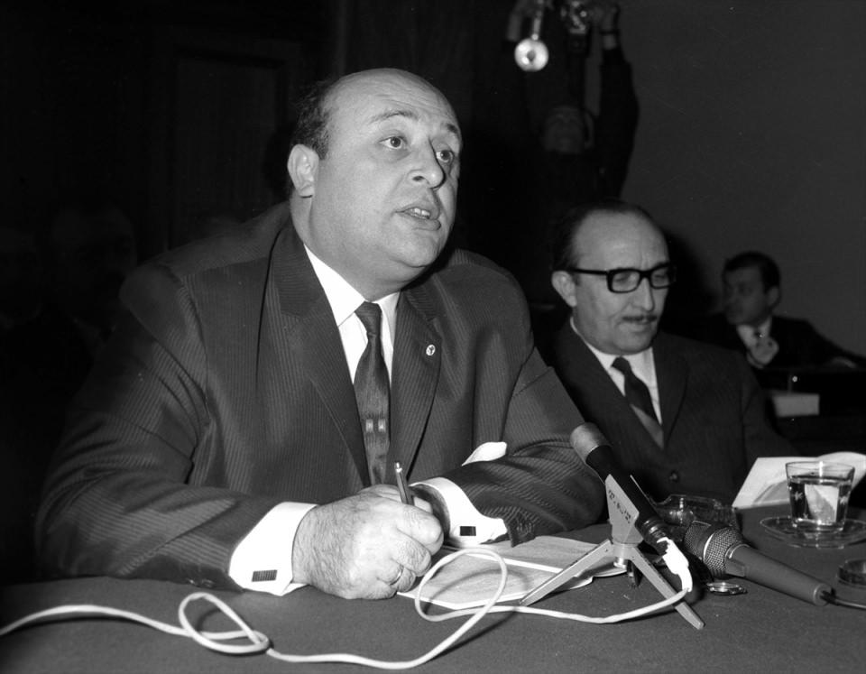 10 Ekim 1965 seçimlerinde tek başına iktidar olan Adalet Partisi (AP) Genel Başkanı Demirel, 4 Ocak 1966'da ilk basın toplantısını düzenlerken görülüyor. Turizm ve Tanıtma Bakanı Nihad Kürşad (sağda)