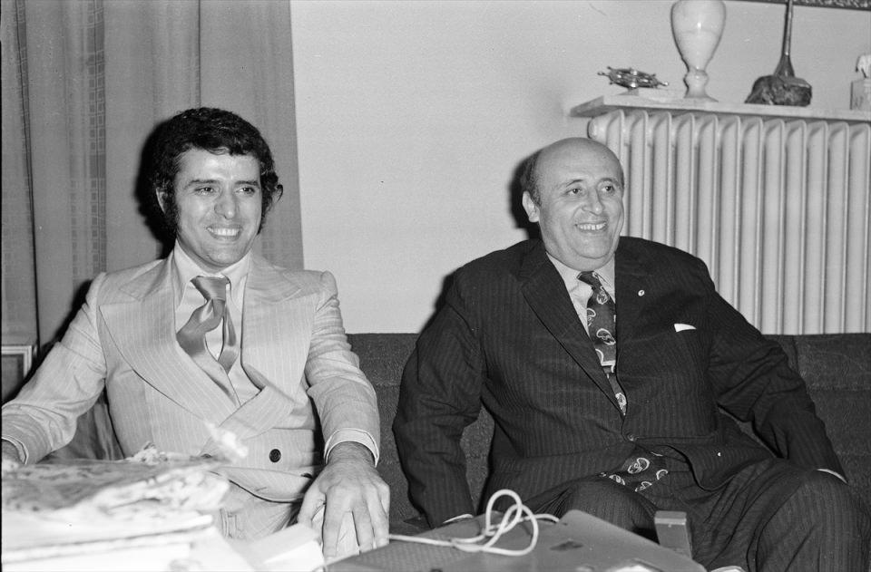 Sanatçı Erol Büyükburç, 1 Ağustos 1972'de Adalet Partisi Genel Başkanı Demirel'i ziyareti sırasında gazetecilere poz verirken görülüyor.