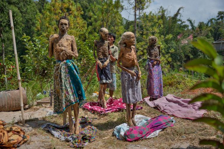 Ma'nene'" sırasında hayattaki aile fertleri farklı kuşaklardan ölü akrabalarıyla bir araya geliyor. Buradakiler, 8 ila 18 yıl önce, 51 ila muhtemelen 110 yaşları arasındayken ölmüş. Akrabaların ziyareti sırasında, ölüler bambu direklere bağlanarak ayakta tutuluyor.