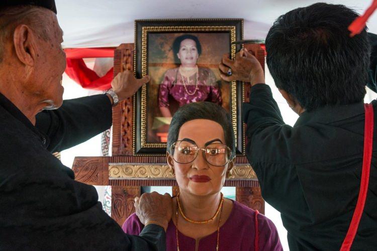 79 yaşında ölen Sampe Rara' Tambing'in fotoğrafı, "tau tau" adı verilen ahşap heykelinin arkasına asılıyor. Yontu bin 500 dolara mal olmuş. "Tau tau"lar genelde mağaralardaki gömü alanlarının dışındaki balkonlara koyuluyor.