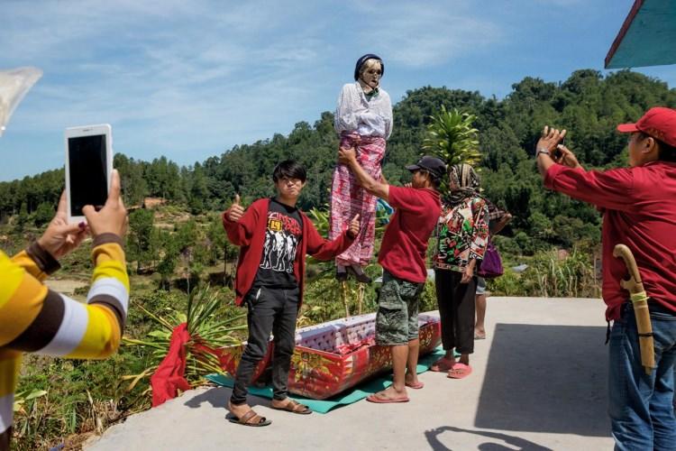2011 yılında ölen Cristina Banne, oğlu Bartolomeus Bunga’ tarafından havaya kaldırılırken torunu Jerry Putra Bunga’ onaylama işareti yapıyor. Torajaların yarıdan çoğu başka yerlerde yaşıyor ve sonuçta cenazeler aileleri yeniden bir araya getirmek gibi bir işlev de üstleniyor.