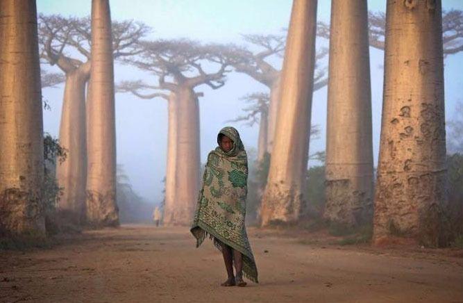 Baobab ağaçları arasında yürüyen Madagaskarlı kız