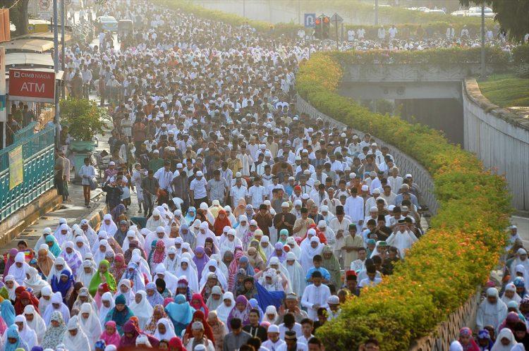 Ramazan Bayramı'nı Türkiye'den bir gün geç kutlamaya başlayan Endonezya'daki Müslümanlar Jakarta'da caddelerde bayram namazını kıldı.