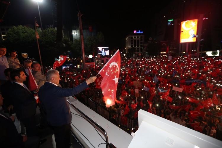 Ankara'da Binali Yıldırım'ın konuşmasında halk yine meydanlarda çoşkulu bir şekilde tekbir getirerek sloganlar atmaya devam etti.