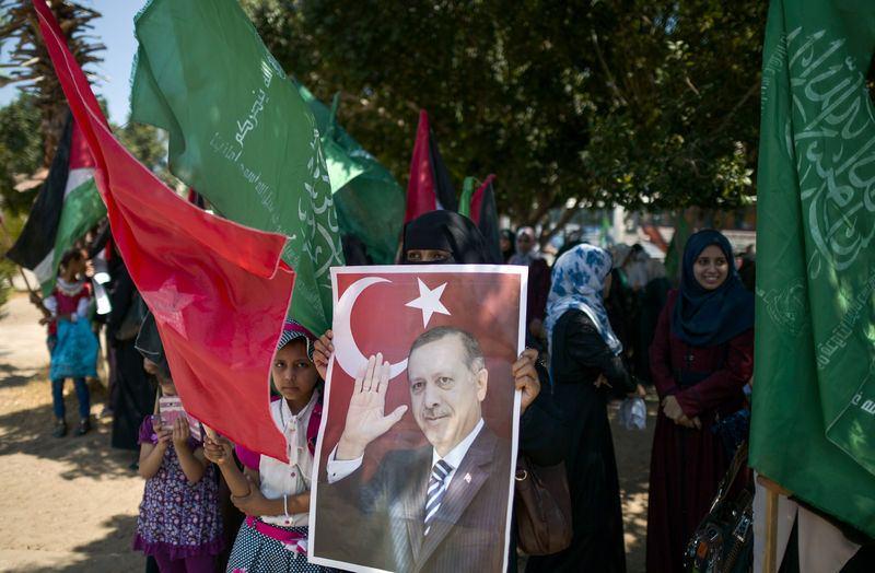 Fetullahçı Terör Örgütü'nün (FETÖ) darbe girişiminin başarısız olmasını kutlayan göstericiler, Türk, Filistin ve Hamas bayrakları ile Cumhurbaşkanı Recep Tayyip Erdoğan'ın posterlerini taşıdı.
