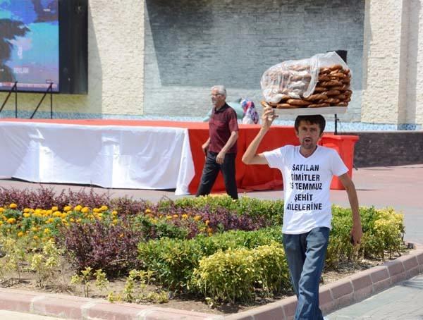 Bir günlük kazancının tamamını 15 Temmuz darbe girişiminde şehit olan vatandaşların ailelerine bağışlayan Erkan Ayhan, satış yaparken de üzerine giydiği tişört ile kampanyasını duyurdu.
