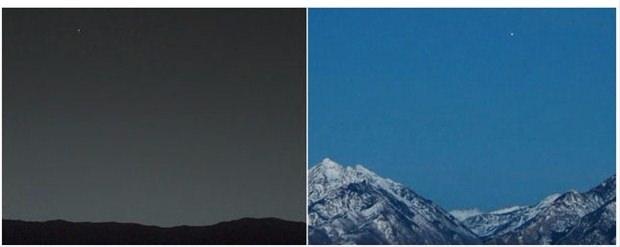 Soldaki fotoğrafta Mars'tan görülen Dünya (Yıldız gibi görülen parlak nokta)... Sağda ise dünyadan görüntülenen Mars