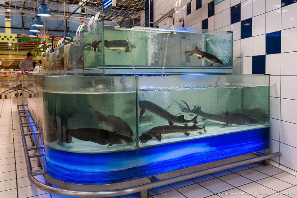 Balık bölümünde ise birbirinden değişik balık çeşitleri böyle akvaryumda satışa sunuluyor.