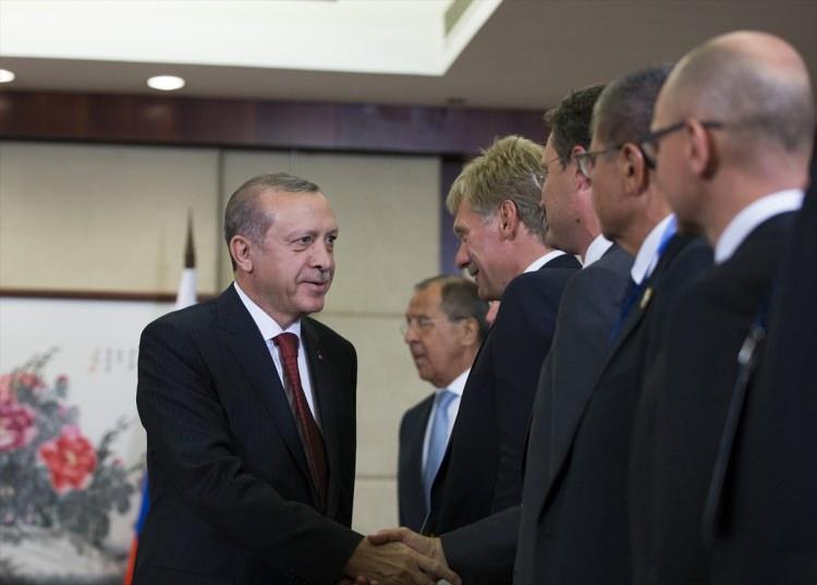 Cumhurbaşkanı Recep Tayyip Erdoğan, G20 Liderler Zirvesi için geldiği Çin Halk Cumhuriyeti'nde Rusya Devlet Başkanı Vladimir Putin ile bir araya geldi. Putin, Cumhurbaşkanı Erdoğan'a heyetteki isimleri tanıttı.