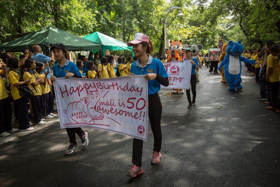 Hayvanat Bahçesi çalışanları ve ziyaretçiler su aygırı Mali'nin 50. doğum günü kutlaması için bir araya geldi.