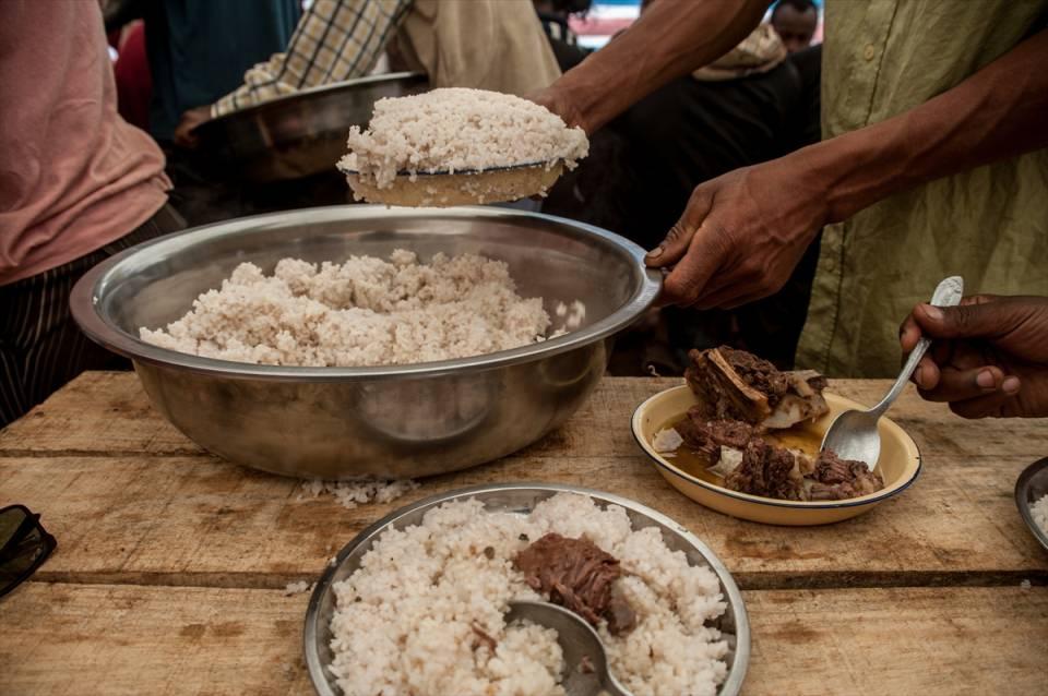 Mezardan çıkartma etkinliğine katılan köylüler, ölen ailelerini onurlandırmak amacıyla katılımcılara kurbanlık et ve pilav dağıtıyorlar.
