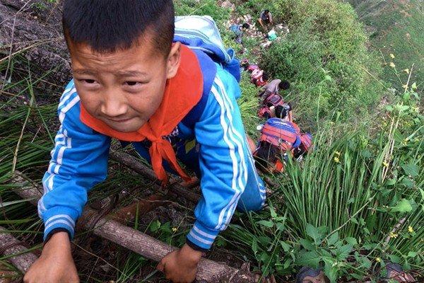 Öğrenciler, sırtlarında çantaları uçurumu tırmanarak eve dönüş yolundalar. Dağların arasındaki köylerine ulaşmak için sarp kayalığı her gün 800 metre tırmanıyorlar.
