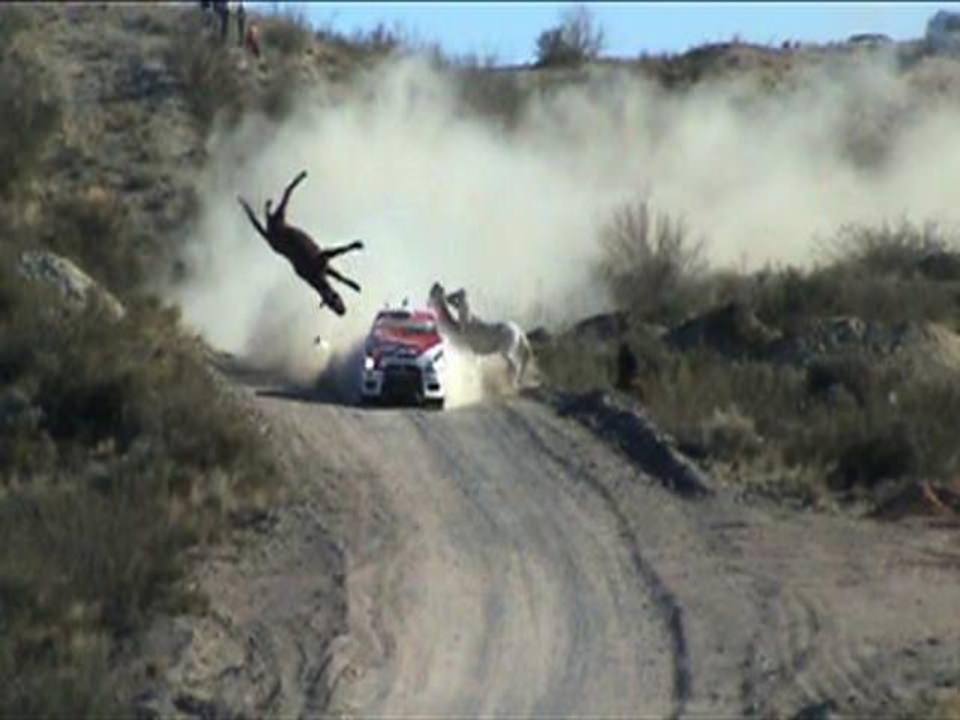 Arjantin’de yapılan 2009 Rally şampiyonası ilginç bir kazaya sahne oldu. Toprak yolda hızla ilerleyen bir yarış otomobili, aniden önüne çıkan 3 atlık bir sürünün arasına daldı.