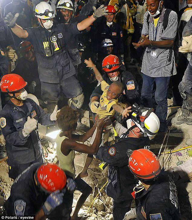 Haiti'de meydana gelen 7 büyüklüğündeki depremin ardından 7 yaşındaki Kiki'nin enkazdan annesinin kolları arasında çıkarılması. (2010)