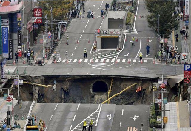 Japonya’nın güneydeki Kyushu adasındaki Fukuoka kentinin ana caddesinde meydana gelen çöküntü beraberinde gas, su ve elektrik hatlarını da beraberinde yuttu.