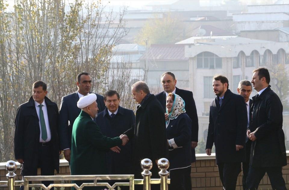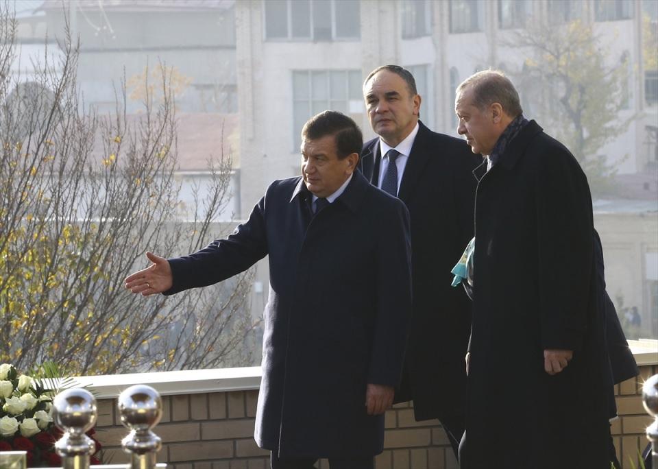 Özbekistan’a ziyaret gerçekleştiren Cumhurbaşkanı Recep Tayyip Erdoğan, Özbekistan Cumhurbaşkanı Vekili ve Başbakan Şevket Mirziyayev'le (solda) birlikte Özbekistan Birinci Cumhurbaşkanı İslam Kerimov’un Semerkant’ta bulunan kabrini ziyaret etti.