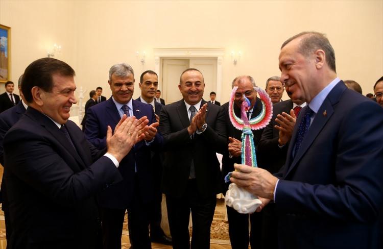 Cumhurbaşkanı Recep Tayyip Erdoğan, Özbekistan’a yaptığı ziyaret kapsamında Özbekistan Cumhurbaşkanı Vekili ve Başbakan Şevket Mirziyayev (solda) ile başbaşa ve heyetlerarası görüşme yaptı. İkili görüşme sonrası Mirziyayev, Cumhurbaşkanı Erdoğan'a el yapımı Huma Kuşu maketini hediye etti.