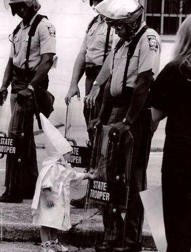 Irkçı radikal örgüt Ku Klux Klan üyelerinden birinin çocuğu, örgütün protestolarından birinde hazır bulunan siyahi polislerden birinin kalkanı ile oynuyor. Küçük çocuğun orada ne için bulunduğu ya da ailesinin siyah insanlara karşı nefreti konusunda bir fikri yok gibi...