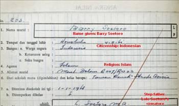 Okul belgelerinde Barry Soetoro olarak kayıt olan Obamanın din hanesine ise İslam yazıldı. Belge, Obamanın önümüzdeki günlerde Endonezyaya yapacağı ziyaret öncesi ortaya çıkarıldı.