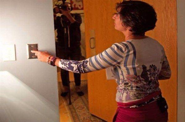 Bunun dışında odada bir çıkış daha bulunuyor. Bu kapı ise ufak banyoya açılıyor. Banyodan da tekrar oturma odasına geçebiliyor. Oturma odasının kapısı kapalıyken, ortaya bir başka ahşap panel çıkıyor.