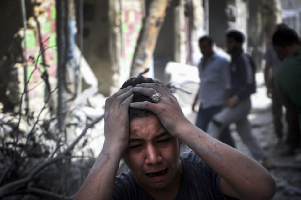 Suriye ordusuna ait bir savaş uçağı, Halep'te muhaliflerin kontrolündeki Meşhed semtine hava saldırısı düzenledi. Saldırıdan etkilenen bir Suriyeli, üzüntü yaşadı.