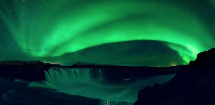 İzlanda’daki Godafoss(Tanrıların Şelalesi) üzerindeki Kuzey Işıkları