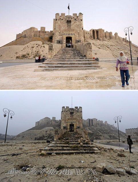 Suriye'nin en büyük kenti Halep'in yaklaşık dört buçuk yılda yaşadığı acı değişimi aynı noktada çekilmiş fotoğraflar gözler önüne seriyor. İşte savaş öncesi ve sonrasında aynı noktada çekilmiş Halep fotoğrafları...