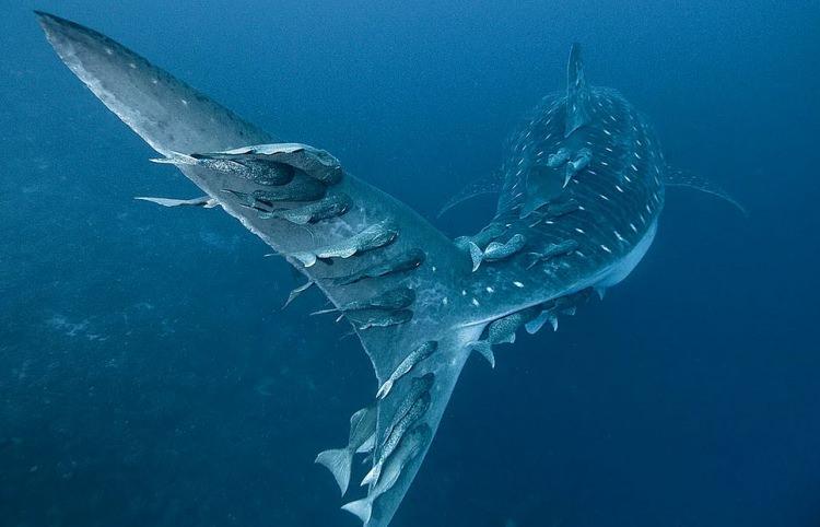 Balina köpek balığına tutunup bedava yolculuk yapan otostopçular.