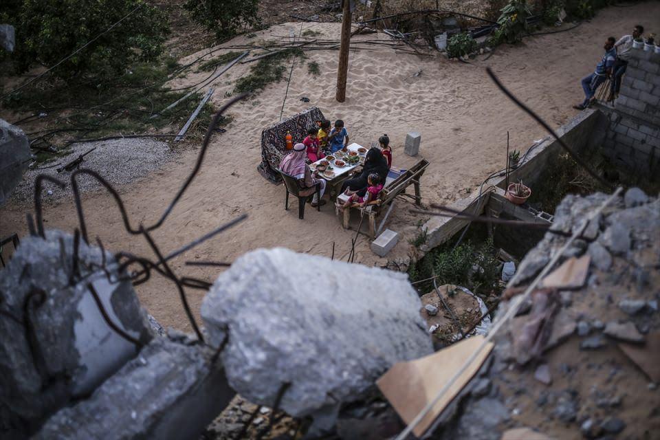 Gazze'nin Han Yunus kentinde yaşayan Filistinli Atıf El Kura ve ailesi, 2014 yılında İsrail'in Gazze'ye düzenlediği saldırılarda yıkılan evinin enkazı arasında oruçlarını açtı.