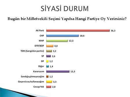 Bugün bir genel seçim olsa; toplam %20,6 kararsızlar, protesto oyları ve cevapsızlar dağıtılmadan Türkiye genelinde halkın %36,3ünün Ak Parti'ye, %18,6sının CHPye ve %12,3ünün de MHPye oy vereceği tahmin edilmektedir.