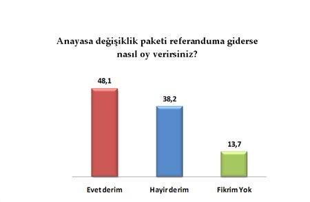 Anayasa değişikliği paketi referanduma giderse halkın yüzde 48,1i EVET oyu vereceğini, yüzde 38,2si HAYIR oyu vereceğini belirtiyor.