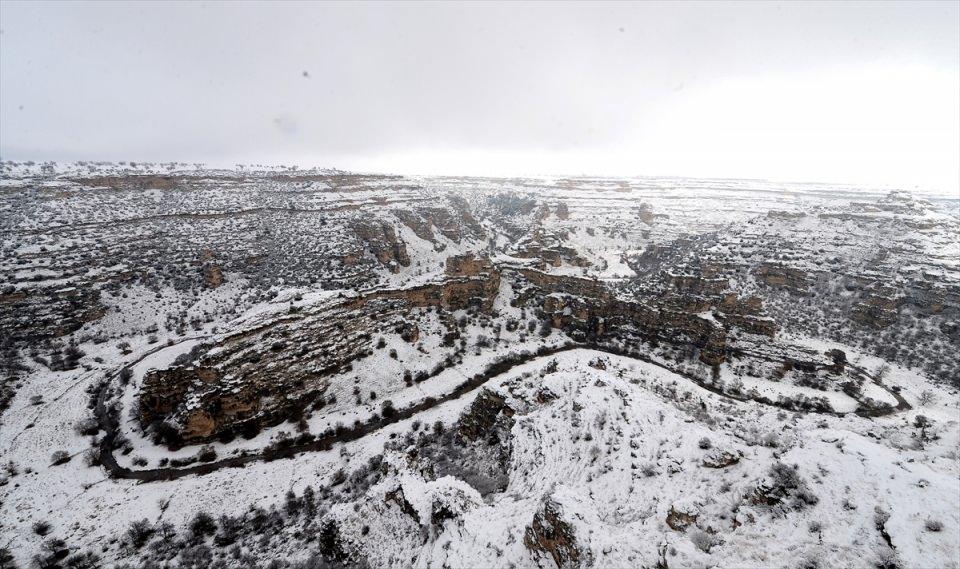 Uşak'ta etkili olan kar yağışı, ABD'deki Grand Kanyon'dan sonra 77 kilometrelik uzunluğuyla dünyanın en uzun ikinci kanyonu olarak bilinen Ulubey Kanyonları'nı beyaza bürüdü.