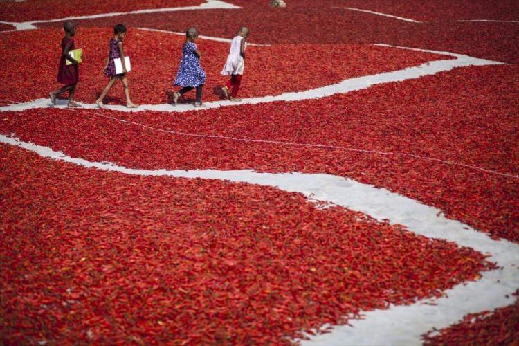 Bangladeş'in Gaibandha şehrinde kadınlar günlük 1 ABD Doları'nın altında ücretle kırmızı biber üretiminide çalışıyor. Tarlalardan toplanan kırmızı biberler güneşin altına serildikten sonra kurumaya bırakılıyor. Düzenli kurumayı sağlamak için belirli aralıklarla kırmızı biberleri karıştıran kadın işçiler; güneşin altında zor şartlarda çalışıyor.