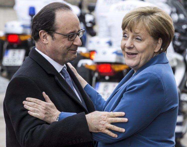 Almanya Başbakanı Angela Merkel (sağda), Almanya'nın Hannover kentinde bulunan Schloss Herrenhausen Sarayı'nda, ABD Başkanı ve Avrupa liderlerinin bir araya geldiği toplantıya katılmak için gelen Fransa Cumhurbaşkanı François Hollande'yi (solda) kapıda karşıladı.