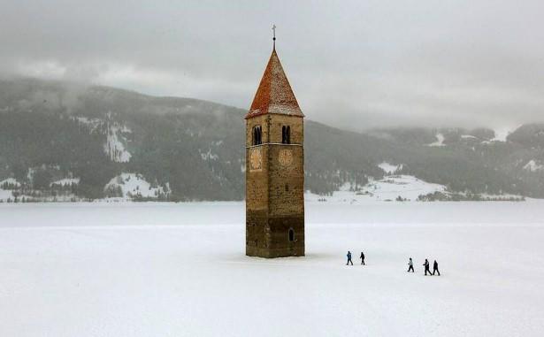 Donmuş bir gölde yükselen kilise kulesi, Reschen, Italy