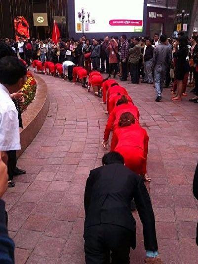 Bölgedeki bir kozmetik mağazası çalışanlarından oluşan grubu etrafta toplananlar görüntülüyor.
