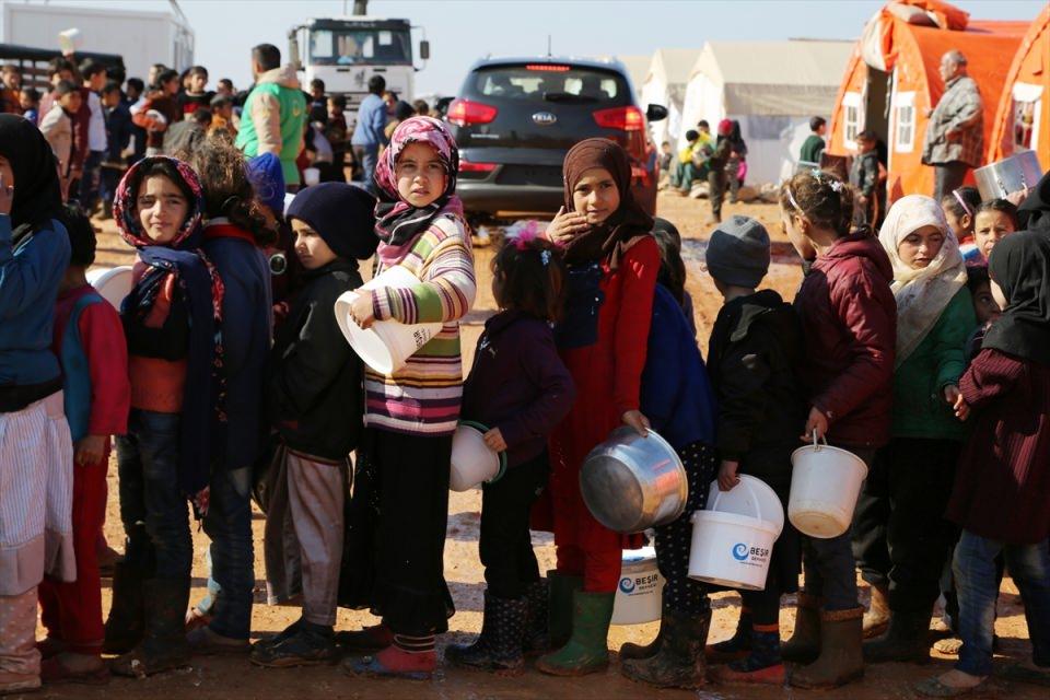 Kamune çadır kentindeki çocukların bazıları çamurlar içinde oyunlarına devam ederken bir kısmı da ekmek almak için sırada bekliyor.