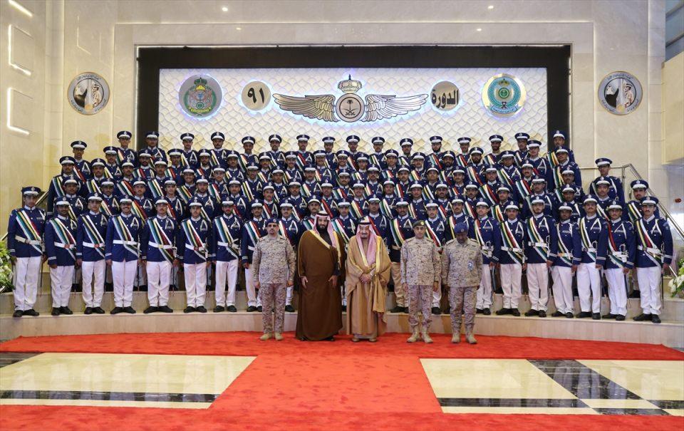 Suudi Arabistan Kralı Selman bin Abdulaziz, Suudi Arabistan İkinci Veliaht Prensi ve Savunma Bakanı Muhammed bin Selman, mezun olan pilotlarla birlikte aile fotoğrafı çektirdi.