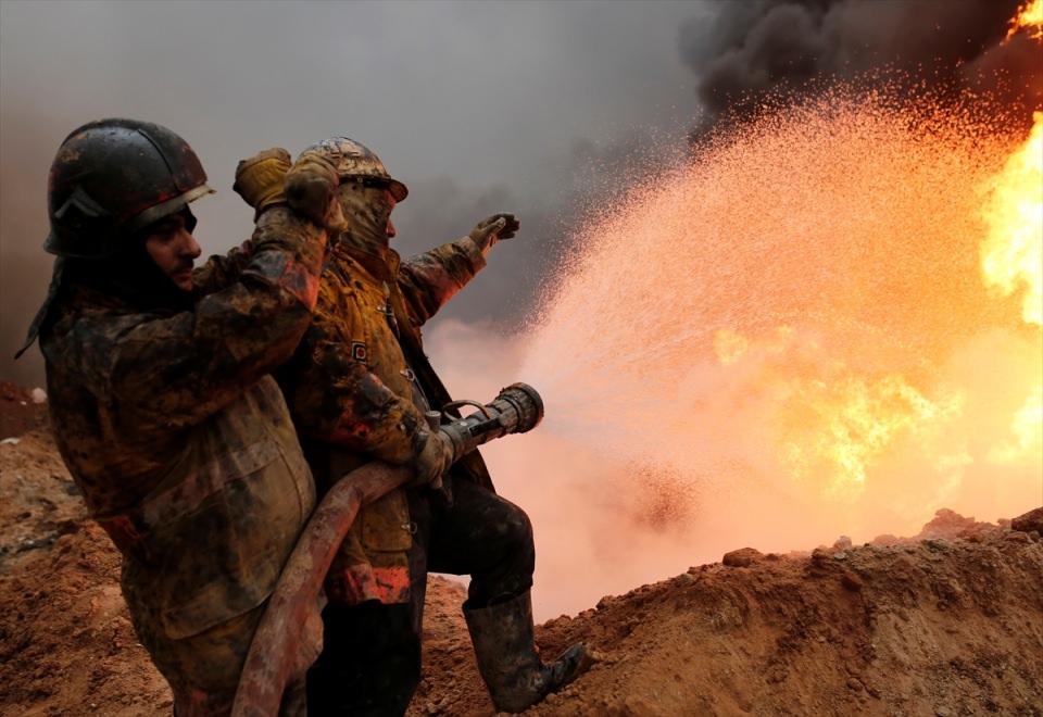 DEAŞ militanlarının bölgeyi terk ettikleri esnada patlayıcılarla imha ettikleri petrol kuyuları, itfaiye ekiplerinin gerçekleştirdiği yangın söndürme çalışmaları ile kontrol altına alınmaya çalışılıyor.
