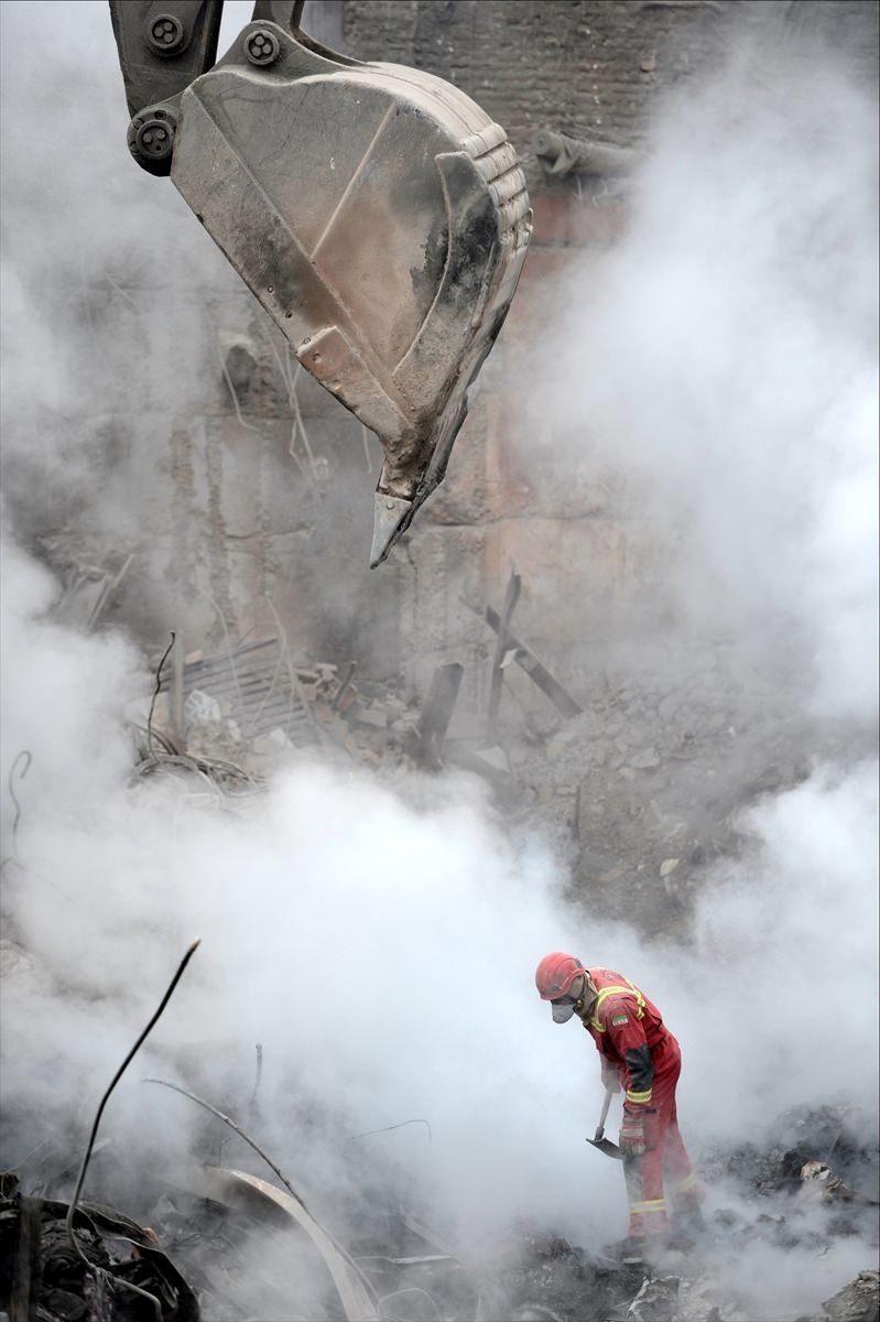 Sıcaklığın yer yer 600 dereceye kadar ulaştığı molozların arasında itfaiye birlikleri çalışmalarını sürdürüyor.