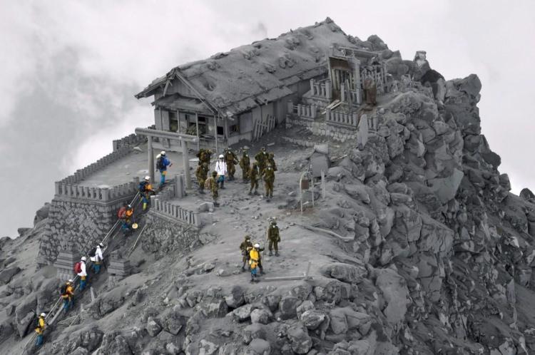 Volkanik patlama sonrası kül ile kaplanan tapınak, Ontake Japonya