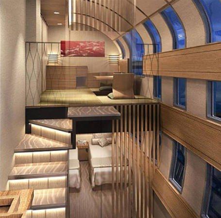 Ünlü Japon şef Katsuhiro Nakamura'nın mutfağını sunan altın renginde bir yemek arabası da trende olan lüks detaylardan.