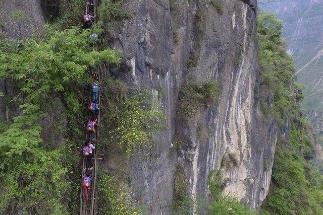 72 haneli Atuder dağ köyünde yaşayan öğrenciler, bu tehlikeli yolculuk için uçuruma monte edilen 17 merdivenli bu yola tırmanmak ve inmek için 2 saatlerini harcıyor.