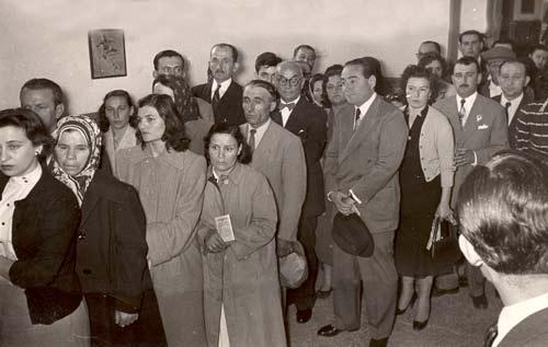 Cumhurbaşkanı Celal Bayar ve Başbakan Adnan Menderes, 1957 genel seçimlerinde oy kullanmak için vatandaşlarla birlikte sıra beklerken görüntülenmiş