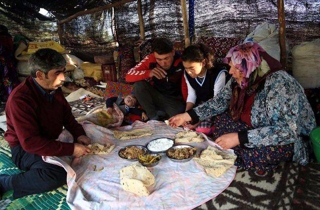 Bölgede çadır kuran 11 Yörük ailenin 6-13 yaş arasındaki 14 çocuğu, önce sabahın erken saatlerinde uyanıp anneleri tarafından kıl çadırda hazırlanan sofrada kahvaltı yapıyor.