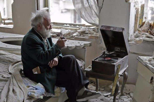 Halep’te yaşayan 70 yaşındaki Muhammed Muhiddin Anis, bombalar altında harabeye dönen evinde hala huzur içinde plak dinlemeye çalışıyor.