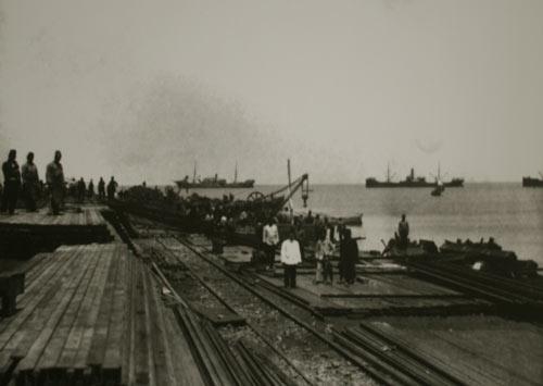 HAMİDİYE HİCAZ DEMİRYOLUNUN HAYFA YOLU MEYDANI OLAN İSTASYON ÖNÜNDE YÜCE HAT İÇİN İNŞAA EDİLEN İSKELEDE YÜKLEME VE BOŞALTMA İŞLEMLERİ - 1905