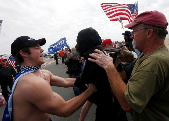 Bir başka olayda ise yerde yatan bir adam Trump destekçisi tarafından tekmelerle ve yumruklarla dövülüyor. Trump karşıtı bir yandan bu sırada biber spreyi sıkmaya çalışıyor.