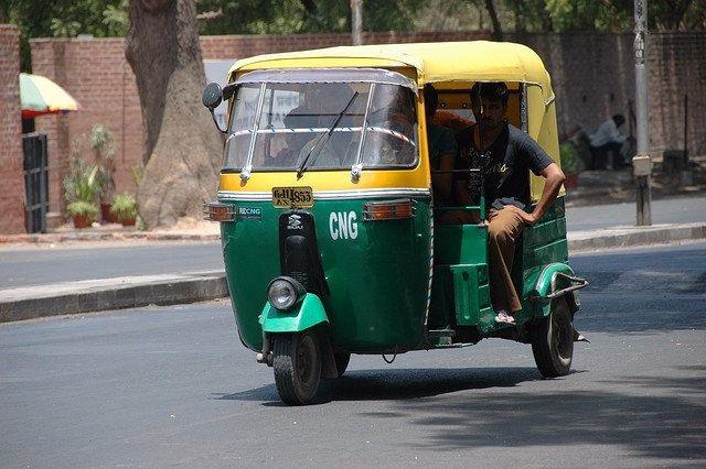 İkinci el arabalar kullanan Premji, hava limanına giderken de triportöre biniyor.